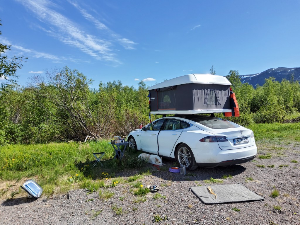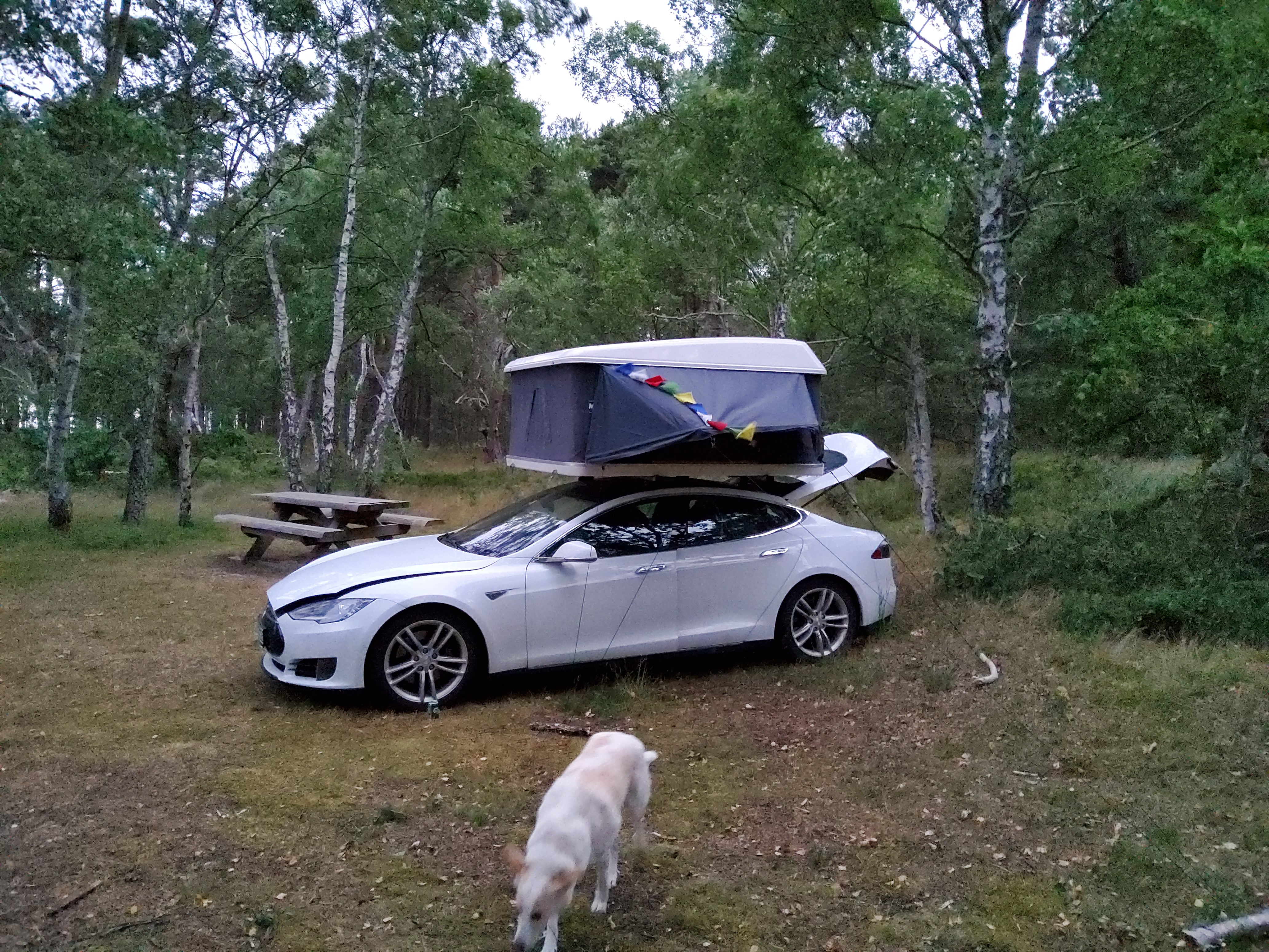 Nevertheless I mounted one of the wings to the side of the roof tent, to protect against the rain. I was hoping also for some wind shelter so I can set up the wood stove – but it is still too windy.